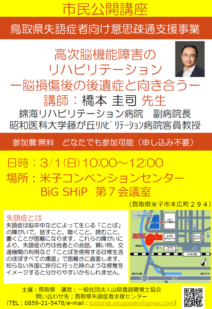 市民公開講座 鳥取県失語症向け意思疎通支援事業「高次脳機能障害のリハビリテーション」(3/1)